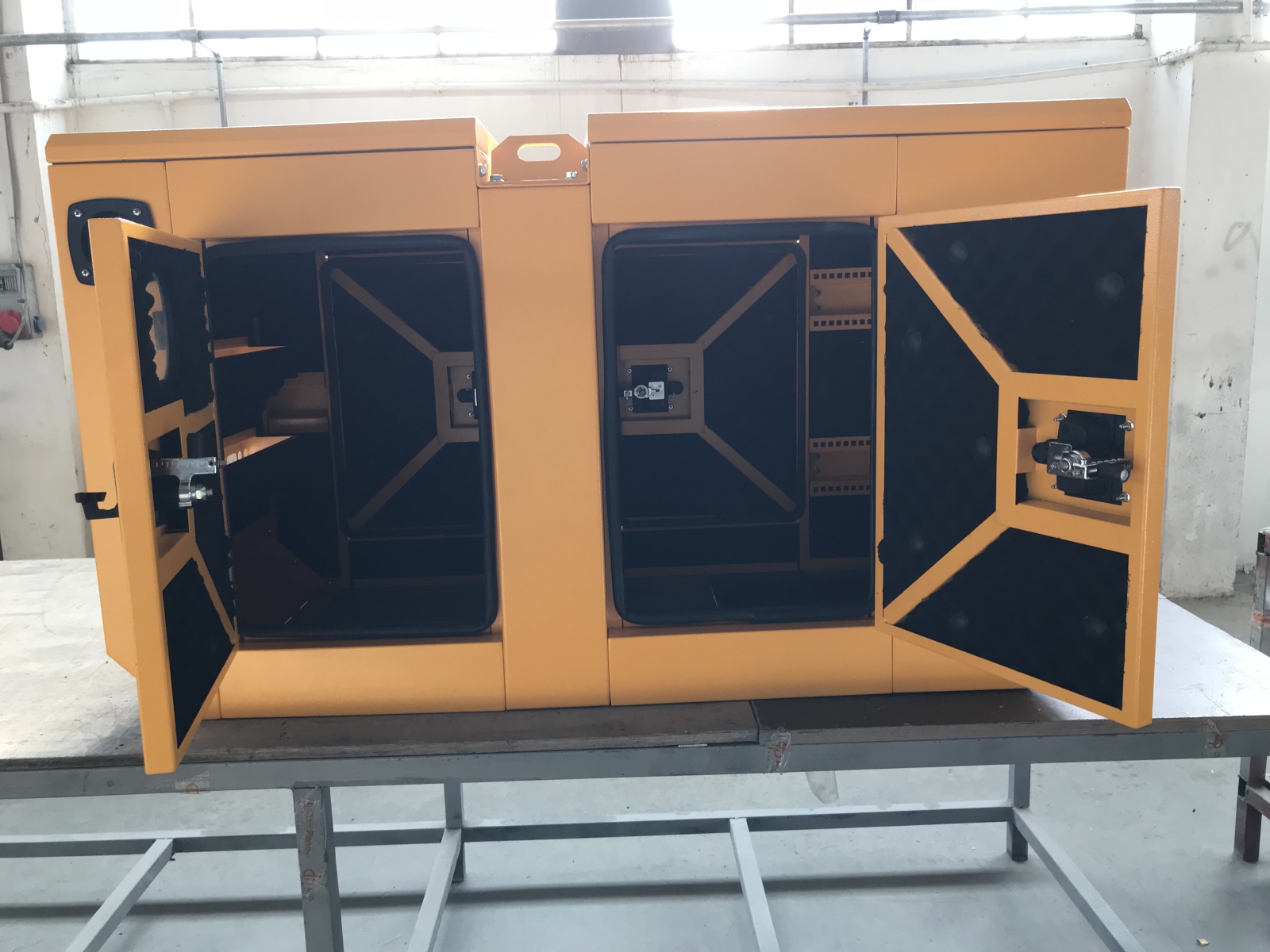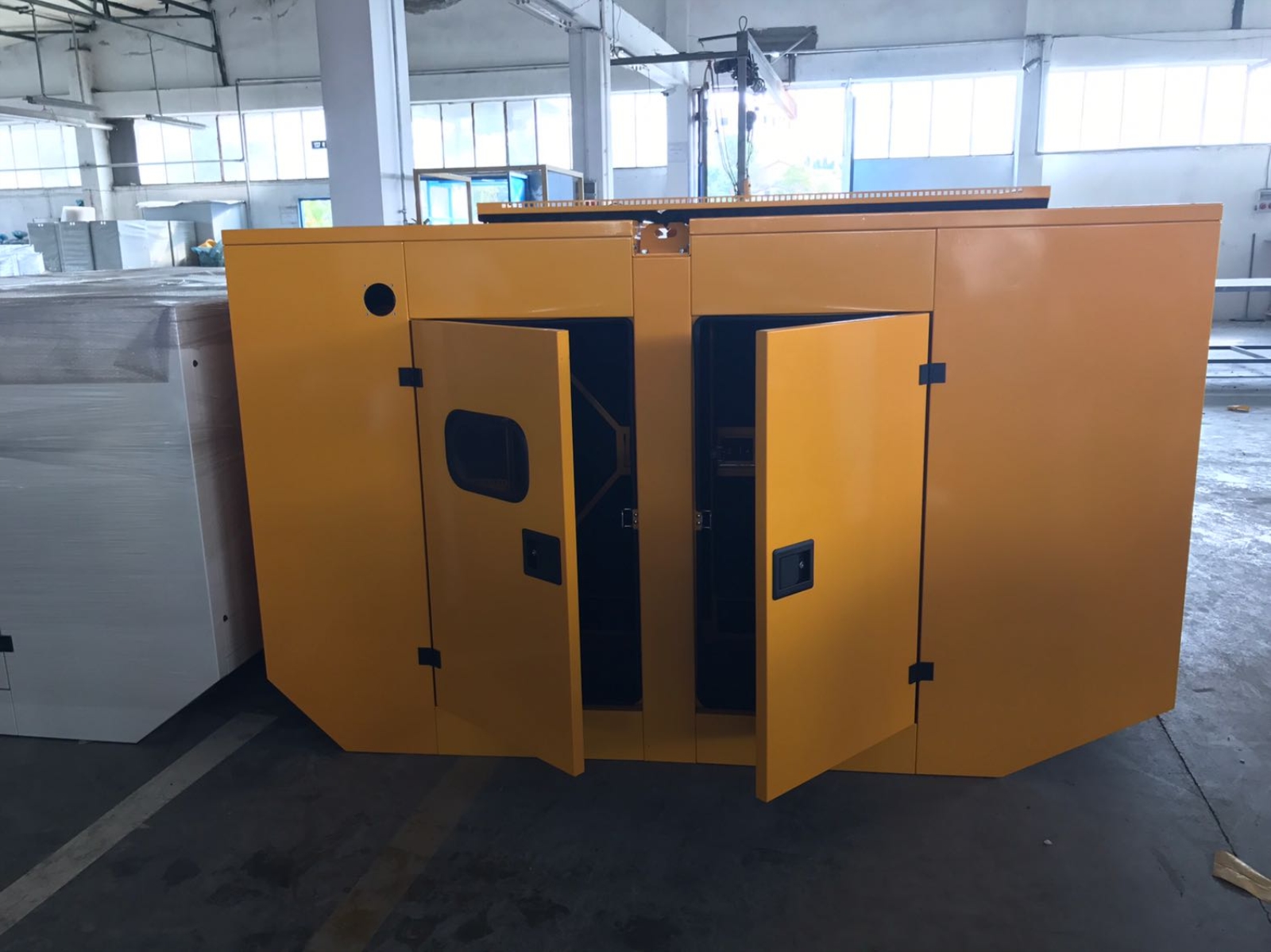 Kabinin çift tarafında kilitlenebilir kapılar & Plastik kollu kilit sistemi & Zamak menteşe Motor türüne göre , sesi en aza indirip performansı yükselten hava sirkülasyon kanalları Standart modellerin yanında müşteri isteğine bağlı tasarım ve renklerdeki kabinlerin üretimi Su geçirmez kabinler Harici ve kabin içi yakıt tankı ( 1.5 mm - 2. mm ) 12 KW ile 1100 KW arası her türlü motor için özel kabin imalatı